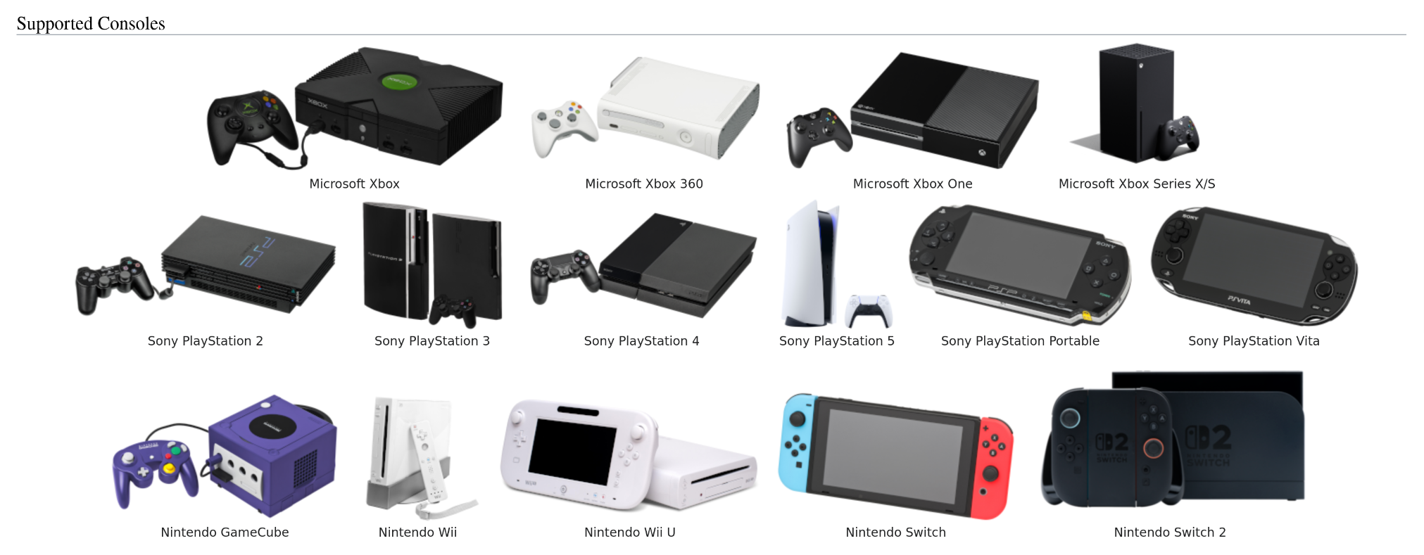 The modding requirements vary significantly by console. While the original Xbox, PlayStation 2, and most other systems work without modification, some consoles like the Wii require homebrew modifications, and Switch local wireless games need custom system modules.