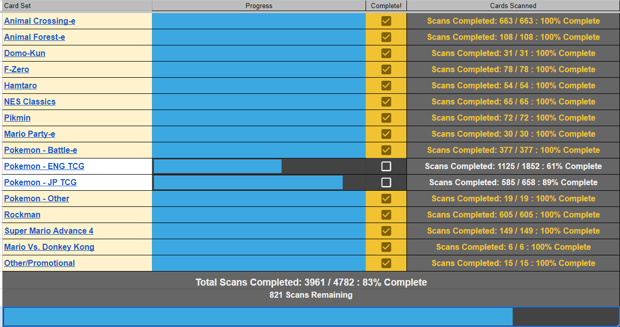 Above you can see a screenshot from our internal spreadsheet. It lists the percentages of the sets we’ve completed and the sets we’ve got left to do; with each variant being treated as a separate card. These percentages do not include prototype cards, only those which have been officially released (prototypes have a separate section on the spreadsheet).