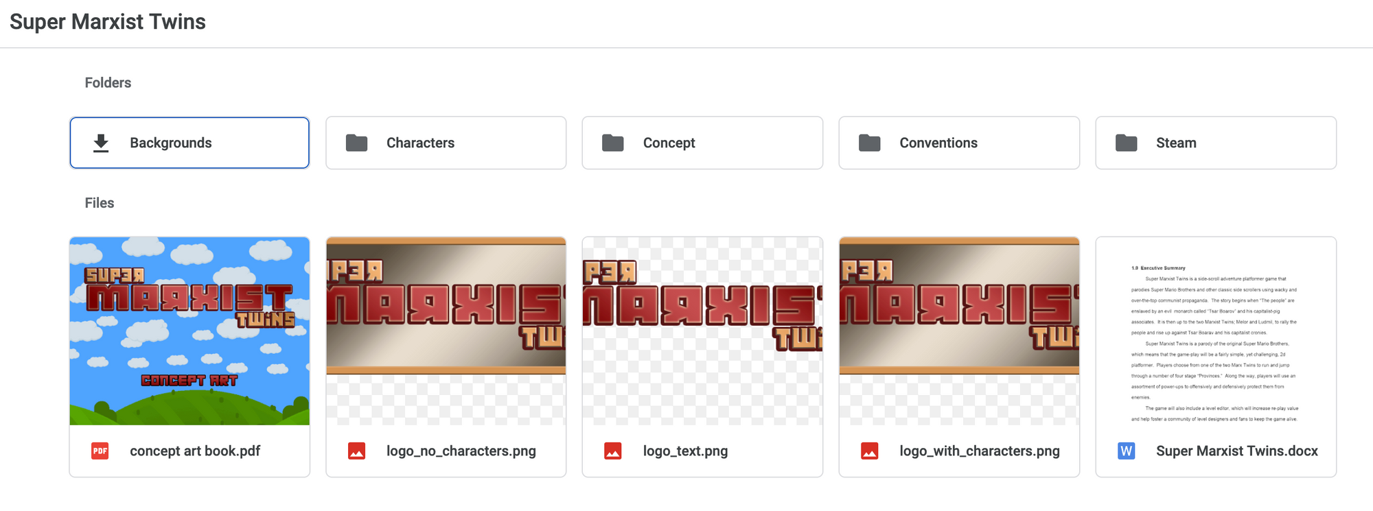 The developers of Super Marxist Twins were also happy to share a large collection of backgrounds, concept art (including scans of original pen and paper drawings), character art (both old and new), design documents, convention photos, and more!