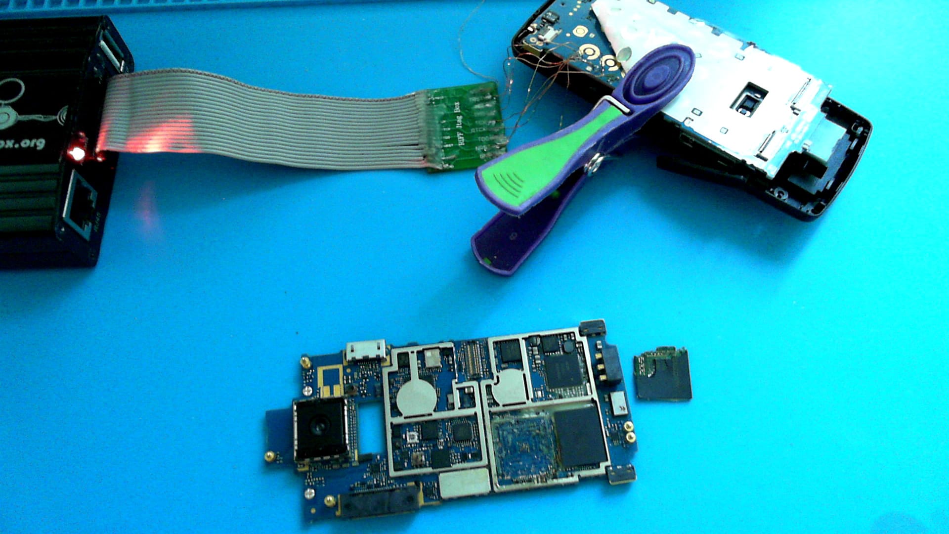 Left: finding JTAG pins on a Sony-Ericsson W53S using Riff-Box. Center and right: the destructive method of dumping a Sony-Ericsson SO005 (image credits to Kraze)