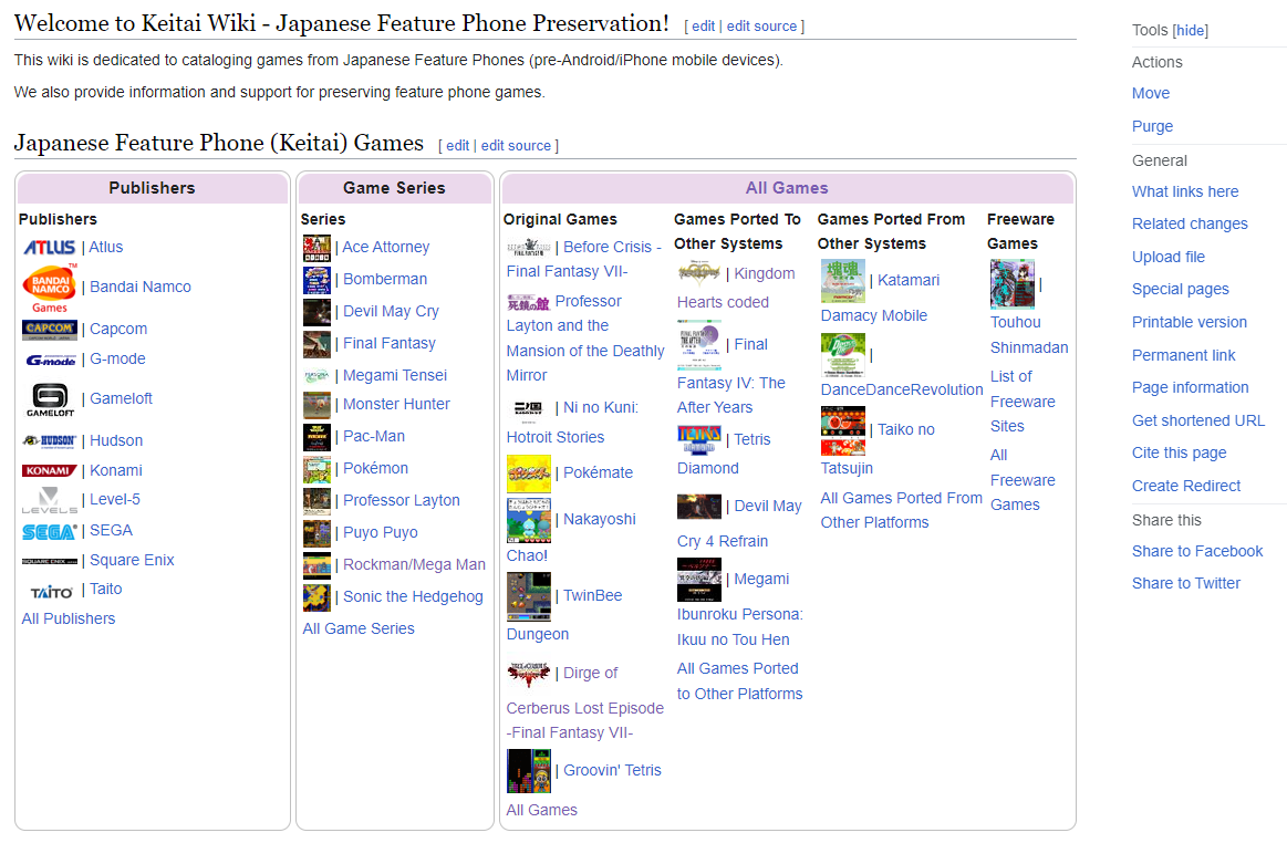 Keitai game preservation, being a very small sect of game preservation at large, did not have a centralized place to find information on games or their preservation. My Hit Save article from last year gave a broad overview of the games and preservation efforts, but it was by no means comprehensive. With three platforms, hundreds of games, and a variety of preservation methods, there needed to be a one-stop-shop for keitai game preservation resources.