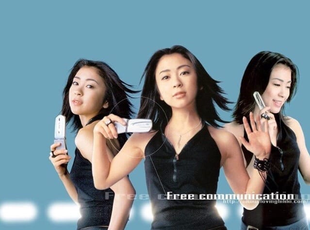 Left: Final Fantasy VII-themed P900iV phone (image credit to NaoyaShinota). Right: pop singer Hikaru Utada advertising DoCoMo feature phones